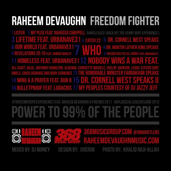 He is the voice of people who have an informed perspective. The Grammy Nominated self proclaimed neo soul r&b hippie rockstar, Raheem Devaughn, understands that progress requires the ability to be fearless. On October 15, 2011 alongside colleague/friend/America’s profound thinkers, Dr. Cornell West, and 18 other participants, he was arrested on the steps of the United States Supreme Court for protesting with Occupy DC. As he described his experience as one of the most enlightening moments of his life, it fueled a fire that’s been brewing to be a catalyst for social change. Often compared to Sam Cooke and Marvin Gaye, Raheem has always included a socially concious message in all of his music. To bring awareness to be the change one wants to see, Raheem Devaughn and DJ Money presents “The Freedom Fighter” featuring all of his socially concious B-Sides with appearances from : Jill Scott, DJ Jazzy Jeff, Min. Louis Farrakhan, Dr. Cornell West, Anthony Hamilton, Chrisette Michele, and others. Please download “Freedom Fighter” at www.368musicgroup.com.