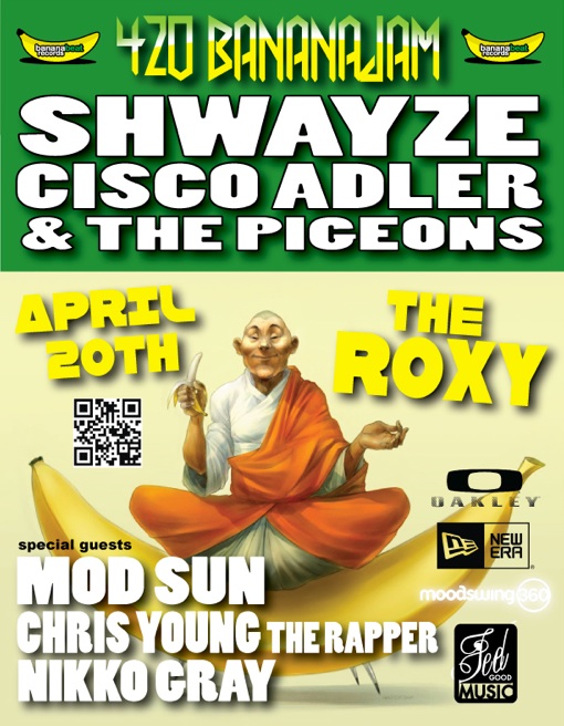 Bananajam marks Cisco Adler & The Pigeons’ first live performance since their incredibly well-received SXSW debut. Frontman, Cisco Adler, will also be performing alongside his hip-hop counterpart, Shwayze. In addition to playing live, Chris Young The Rapper will be dropping his highly anticipated Value Pack 2: Cream & Sugar at the show. Mod Sun, who is in the running for Rolling Stone’s Choose The Cover contest, will be bringing even more high energy hip-hop to the renowned LA venue. Rounding out the lineup, California based songstress, Nikko Gray will offer up her innovative, experimental take on soul to Bananajam.