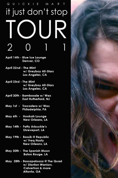 Fresh off a slew of live dates across America, New Orleans-bred, L.A.-based producer/deejay Quickie Mart presents the aptly-named It Just Don’t Stop, a free mixtape of some of the underground’s most influential tunes, remixed Quickie Mart style. In the last two years alone he has released three volumes of the Haze Diaries mixtape series with rapper Gotham Green, featuring Freddie Gibbs and Planet Asia. Gypsyphonic Disko, his klezmer/New Orleans bounce/hip-hop fusion project with Ben Ellman of Galactic, was included in Nerve.com‘s Five Albums You Should Be Listening To Right Now, and his Brain Salad Surgery mashup tape was released in late 2009. See below for May tour dates across the country.
