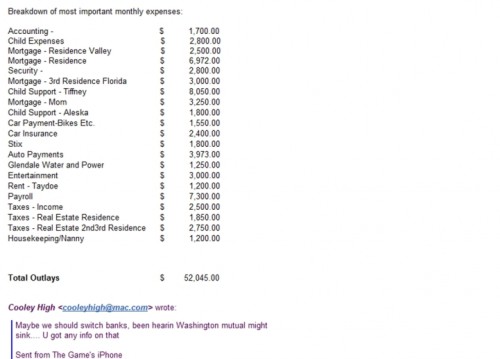 This is just as funny as it is fucked up. Someone hacked into The Game’s e-mail recently and found what appears to be an email message outlining his monthly expenses. The costs include mortgage payments for FOUR(!?) properties, taxes, security detail, child support payments and other various living expenses. To most of us people, these…